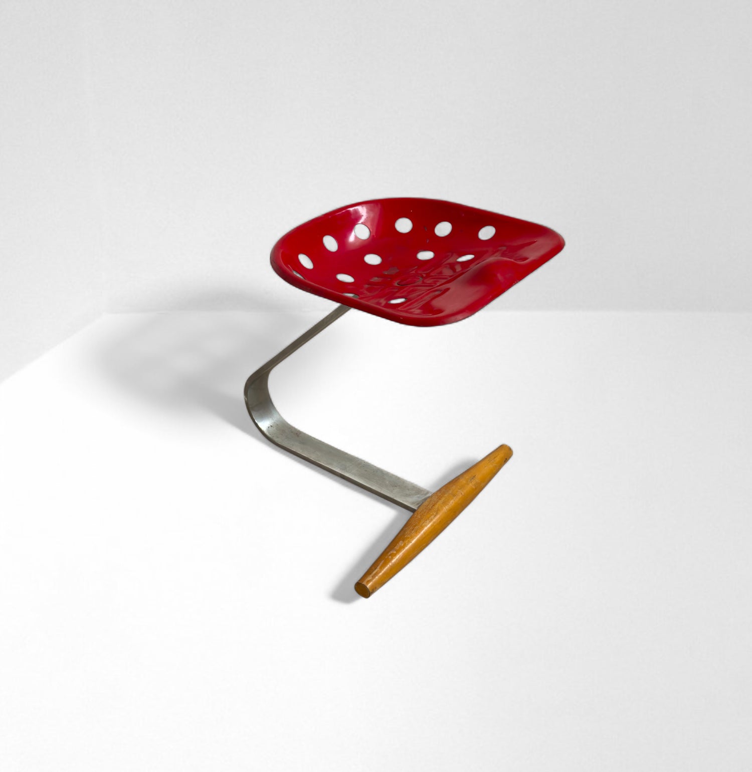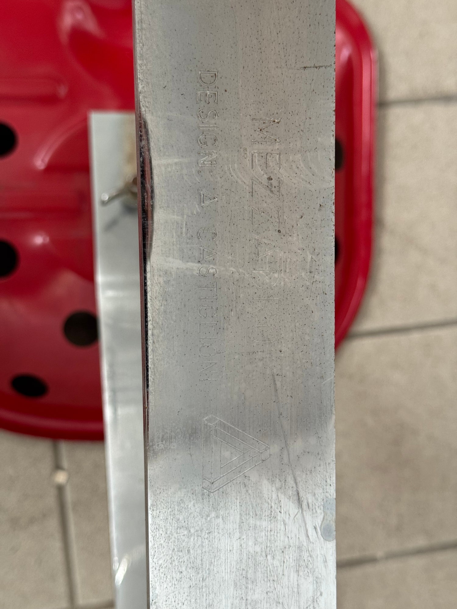 Chromed steel support and beech base, seat in pressed and painted sheet metal. Prod. Zanotta 1970